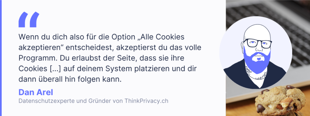 Wenn du dich also für die Option „Alle Cookies akzeptieren“ entscheidest, akzeptierst du das volle Programm. Du erlaubst der Seite, dass sie ihre Chocolate-Chip- und Rosinen-Cookies – oder eine andere Sorte ihrer Wahl – auf deinem System platzieren und dir dann überall hin folgen kann.