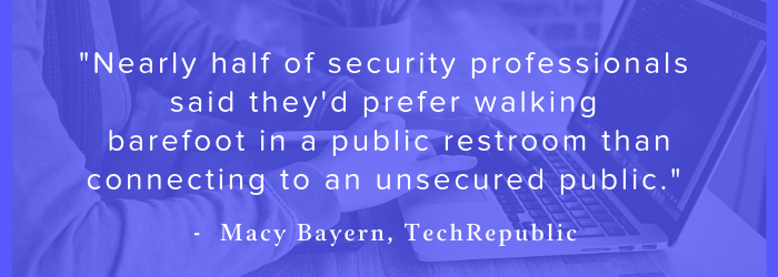 “Nearly half (45%) of security professionals said they’d prefer walking barefoot in a public restroom than connecting to an unsecured public Wi-Fi network” reported TechRepublic writer Macy Bayern.*